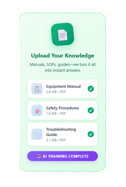 Trained exclusively on YOUR documentation. No generic internet answers. Only information from your company manuals and procedures.